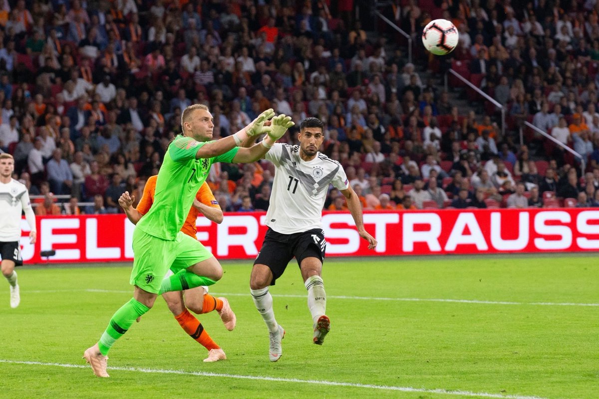 وضمن فعاليات المجموعة الاولى من المستوى الاول، تعرض المنتخب الألماني لخسارة مخيبة أمام المنتخب الهولندي بثلاثية دون مقابل على ملعب الاسطورة يوهان كرويف في امستردام. وكان الشوط الاول مثيراً بين المنتخبين وبدأت الألماني بالضغط على الدفاع الهولندي ولكن أصحاب الأرض استطاعوا التصدي لهجوم الألمان البطيء. وبعكس مجريات اللعب نجح المنتخب الهولندي من افتتاح التسجيل في الدقيقة 30 عبر المدافع فيرجيل فان دايك بعد متابعة جميلة لرأسية ريان بابل والتي ارتطمت بالعارضة حيث ارتاح أصحاب الأرض وأصبح أكثر ثقة لينتهي الشوط الأول بتقدم هولندا بهدف نظيف.