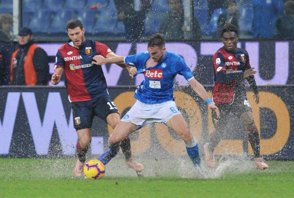 وتأتي المباراة بين جنوى ونابولي والتي أقيمت على ملعب لويغي فيراريس، حيث استطاع أصحاب الأرض افتتاح التسجيل عبر اللاعب كريستيان كوامي في الدقيقة ال20 لينتهي الشوط الأول بتقدم جنوى بهدف نظيف. ومع بداية الشوط الثاني دخل أبناء المدرب كارلو أنشيلوتي بثقة كبيرة هادين لتسجيل هدف التعادل، حيث واصل لاعبو نابولي ضغطهم ليحتدم الصراع اكثر بين الفريقين وكان لفريق الضيوف بعض التمريرات وسط حصار مستمر من لاعبي جنوى في المنطقة الدفاعية. ومع استمرار اللعب قرر الحكم ايقاف المباراة بسبب الأمطار الغزيرة التي لم تسمح للاعبين التركيز في المباراة. وعند العودة مجدداً الى أجواء المباراة استطاع فابيان رويز تسجيل هدف التعادل أخيراً عند الدقيقة 62 بعد تمريرة خطيرة من النجم البلجيكي درايز ميرتينز. وبعد التعادل أصبحت المباراة أكثر اثارة واحتمد الصراع بين الفريقين الى أن سجل دافيدي بيراسكي هدف في مرمى فريقه في الدقيقة 86 بعد خطأ دفاعي، لتنتهي المباراة بفوز نابولي بهدفين مقابل هدف وحيد لجنوى الذي يتجمد رصيده ب14 نقطة في المركز الرابع عشر.